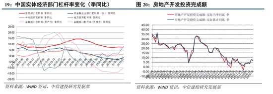 此外短期內(nèi),信用結(jié)構(gòu)調(diào)整進(jìn)入深水區(qū)。不可否認(rèn),房地產(chǎn)是在擴(kuò)信用的目的達(dá)成上最迅速有效的一個(gè)手段,但基于當(dāng)前面臨的經(jīng)濟(jì)和產(chǎn)業(yè)結(jié)構(gòu)上長(zhǎng)線轉(zhuǎn)型的核心關(guān)鍵,今年二季度開始,政策對(duì)房地產(chǎn)熱度抬頭的跡象嚴(yán)厲打擊。實(shí)際上,從數(shù)據(jù)上看,2017年開始,地方政府杠桿率同比增速即開始觸底回升,說明當(dāng)時(shí)基建產(chǎn)業(yè)鏈已經(jīng)開始為托底經(jīng)濟(jì)加杠桿,金融部門、非金融企業(yè)部門和居民部門杠桿率的同比增速則在18年開始呈止跌回升態(tài)勢(shì),其中房地產(chǎn)的企穩(wěn)功不可沒——也就是說,此前在穩(wěn)定總量信用和經(jīng)濟(jì)托底的過程中,基建和房地產(chǎn)等舊部門仍然是中堅(jiān)力量,那么在當(dāng)前,基建短期空間較為有限、房地產(chǎn)主要融資渠道越發(fā)受限的情況下,這兩個(gè)產(chǎn)業(yè)鏈上的收縮預(yù)計(jì)會(huì)對(duì)信用數(shù)據(jù)的穩(wěn)定擴(kuò)張上產(chǎn)生短期擾動(dòng)。