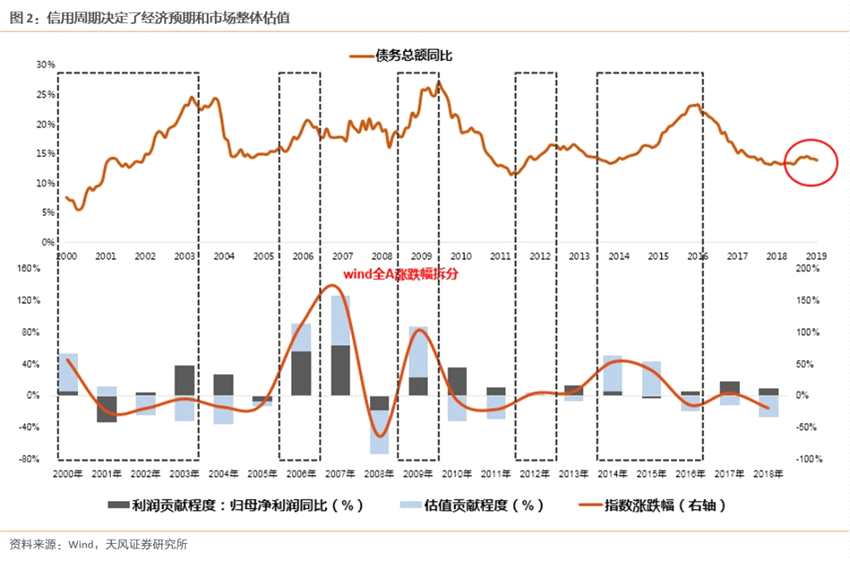 歷史上五輪信用周期,都發(fā)生著同樣的事情:“信用全面擴(kuò)張——市場整體估值抬升(賺估值增長的錢)——盈利逐步企穩(wěn)(賺業(yè)績增長的錢)——信用全面收縮——市場整體估值下移”,以此往復(fù)。