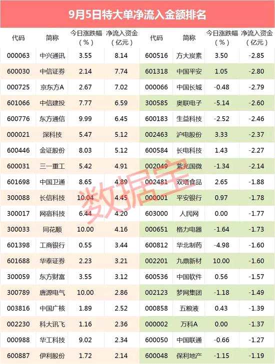 今日有55股特大單凈流入超億元,23股凈流出超億元。中興通訊特大單凈流入居首,全天凈流入8.14億元,該股盤中漲幅近5%。中信證券、京東方A分別凈流入7.7億元和7億元。