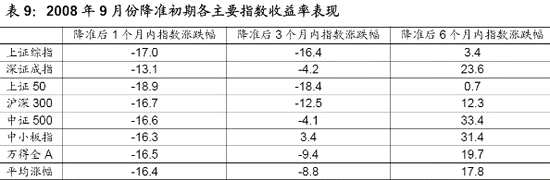 從權(quán)益市場表現(xiàn)來看,由于處于金融危機期間,本次降準(zhǔn)后1個月內(nèi)各主要指數(shù)延續(xù)跌勢,平均跌幅達16.4%,同期申萬28個行業(yè)指數(shù)同樣普遍下跌,僅房地產(chǎn)行業(yè)小幅收漲,其中有色金屬、休閑服務(wù)、采掘行業(yè)跌幅居前。本次降準(zhǔn)后3個月內(nèi)各主要指數(shù)同樣僅中小板指等指數(shù)小幅收漲,其他市場指數(shù)紛紛收跌,同期申萬28個行業(yè)指數(shù)下跌居多,其中電氣設(shè)備、醫(yī)藥生物、建筑材料行業(yè)表現(xiàn)居前,而采掘、交通運輸、非銀金融等行業(yè)表現(xiàn)墊底。本次降準(zhǔn)后6個月內(nèi)各主要指數(shù)全部上漲,同期申萬28個行業(yè)指數(shù)普遍上漲,僅鋼鐵和交通運輸行業(yè)小幅收跌。