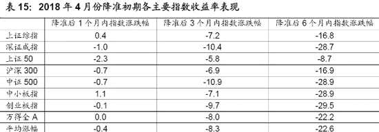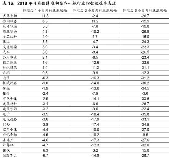 從權(quán)益市場具體表現(xiàn)來看,本次降準(zhǔn)后1個月內(nèi)各主要指數(shù)各主要指數(shù)下跌居多,不過此時的平均跌幅僅為0.4%,同期申萬28個行業(yè)指數(shù)漲跌參半,其中醫(yī)藥生物、休閑服務(wù)、農(nóng)林牧漁等行業(yè)漲幅居前,而軍工、鋼鐵和計算機行業(yè)跌幅居前。本次降準(zhǔn)后3個月內(nèi)各主要指數(shù)跌幅有所擴大,平均跌幅為8.3%,同期申萬28個行業(yè)指數(shù)僅休閑服務(wù)和食品飲料行業(yè)小幅收漲,其余行業(yè)全部下跌。本次降準(zhǔn)后6個月各主要指數(shù)平均跌幅進一步擴大至22.6%,同期申萬28個行業(yè)指數(shù)依然是全部下跌,其中電子、綜合、傳媒等行業(yè)大幅領(lǐng)跌。