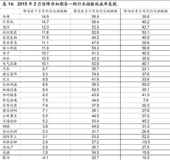 從權(quán)益市場具體表現(xiàn)來看,本次降準(zhǔn)后1個月內(nèi)各主要指數(shù)僅上證50指數(shù)小幅收跌,各主要指數(shù)平均漲幅為6.3%,同期申萬28個行業(yè)指數(shù)普遍上漲,僅銀行行業(yè)小幅收跌,其中傳媒、計算機、通信等行業(yè)漲幅居前。本次降準(zhǔn)后3個月內(nèi)各主要指數(shù)均實現(xiàn)了較大幅度的上漲,平均漲幅高達39.8%,同期申萬28個行業(yè)指數(shù)全部上漲,其中建筑裝飾、機械設(shè)備、計算機行業(yè)漲幅居前。本次降準(zhǔn)6個月后股災(zāi)第一階段已開始爆發(fā),各主要指數(shù)平均漲幅縮小至24.6%,同期申萬28個行業(yè)指數(shù)依然是上漲居多,不過漲幅多有縮減,其中非銀金融行業(yè)累計下跌10.5%,在所有行業(yè)中表現(xiàn)墊底。