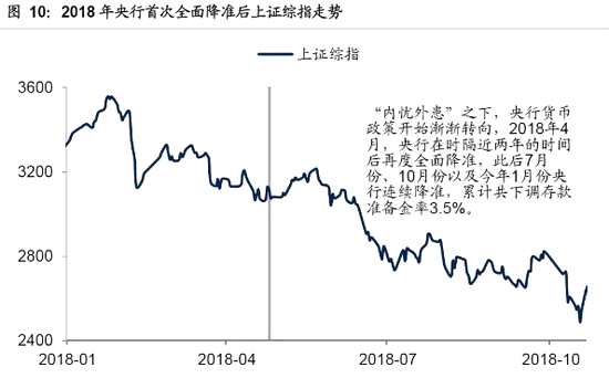 “內(nèi)憂外患”之下,央行貨幣政策開始漸漸轉(zhuǎn)向,2018年4月,央行在時隔近兩年的時間后再度全面降準(zhǔn),此后7月份、10月份以及今年1月份央行連續(xù)降準(zhǔn),累計共下調(diào)存款準(zhǔn)備金率3.5%。