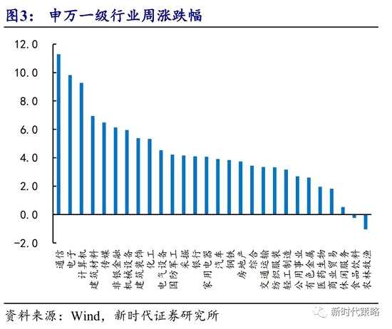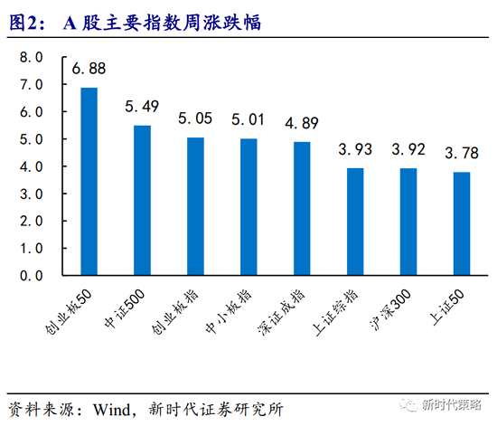 上周A股全線上漲,其中以創(chuàng)業(yè)板50和中證500領(lǐng)漲,漲幅分別為6.88%和5.49%。申萬一級(jí)行業(yè)中,除農(nóng)林牧漁(-1.04%)和食品飲料(-0.24%)下跌其余行業(yè)均上漲,其中通信(11.29%)、電子(9.83%)、計(jì)算機(jī)(9.28%)領(lǐng)漲。概念類中,3D傳感指數(shù)(13.74%)、打板指數(shù)(13.63%)和寬帶提速指數(shù)(12.38%)領(lǐng)漲,生物育種指數(shù)領(lǐng)跌(-0.54%)。