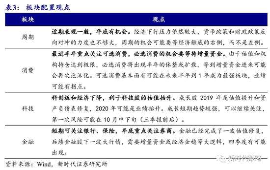 行業(yè)配置建議:板塊配置上,建議投資者積極改變配置思路。在板塊配置上、個(gè)股的選擇上,可以適當(dāng)做得更激進(jìn)。2017-2018年,A股的選股標(biāo)準(zhǔn)更多的強(qiáng)調(diào)了穩(wěn)定性、壁壘、品牌等,但是未來的半年我們傾向于配置彈性,甚至?xí)泻芏噙^去兩年較差的個(gè)股出現(xiàn)估值修復(fù),如果是有業(yè)績(jī)的變化,甚至還能戴維斯雙擊。建議重點(diǎn)關(guān)注科技和可選消費(fèi),可選消費(fèi)將會(huì)逐步顯現(xiàn)出越來越多的機(jī)會(huì),其中的政策敏感性板塊可能會(huì)更早開始博弈,基本面右側(cè)的信號(hào)可能比預(yù)期的略慢了一點(diǎn),等待4季度。