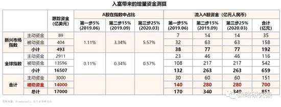 數(shù)據(jù)與假設(shè):(1)富時(shí)羅素?cái)?shù)據(jù)顯示,A股完成第一階段后在全球市場(chǎng)指數(shù)權(quán)重將達(dá)0.57%,在新興市場(chǎng)指數(shù)權(quán)重將達(dá)5.57%,帶來(lái)被動(dòng)增量資金100億美元,約700億元人民幣。推算三步分別帶來(lái)被動(dòng)資金140、280、280億元人民幣。(2)截至2017年末,有1.7萬(wàn)億美元的資產(chǎn)以富時(shí)全球指數(shù)系列指數(shù)為基準(zhǔn),其中1.4萬(wàn)億是被動(dòng)資金。假設(shè)主動(dòng)資金與被動(dòng)資金對(duì)全球指數(shù)、新興指數(shù)的跟蹤比例一致。