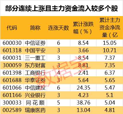 值得注意的是,996只連續(xù)上漲個股中,54只個股期間主力資金累計(jì)凈流入超過億元。其中,累計(jì)資金流入最多的為中信證券,主力資金累計(jì)流入15.05億元。