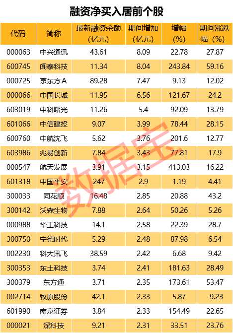 從絕對(duì)金額統(tǒng)計(jì),兩融余額連升期間,融資余額合計(jì)增加293.02億元,其中,融資余額增加億元以上的有97只,融資余額增加最多的是中興通期間融資余額累計(jì)增加8.09億元,增幅為22.78%;聞泰科技、【京東方A(000725)、股吧】等融資余額分別增加8.04億元、7.47億元,位居第二、第三。