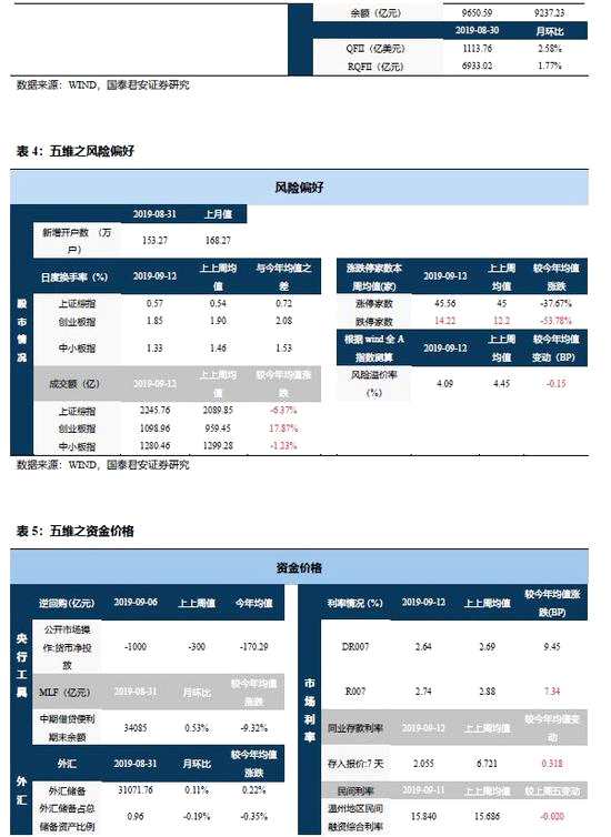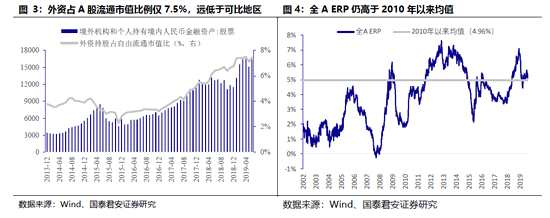 A股對外開放加速將提升A股估值。9月10日外管局決定取消QFII與RQFII的投資額度限制。盡管qfii和rqfii實際獲批額度均不及限額的4成,外管局取消限制還是表明我國金融對外開放將加快。截至2019年上半年末,外資持股占A股自由流通市值僅7.5%,當(dāng)前韓國、臺灣外資持股比例分別為33%、38%,A股仍有較大外資增持空間。9月23日標(biāo)普道瓊斯和富時羅素分別將A股納入指數(shù)體系或提升納入比例,11月MSCI繼續(xù)提升A股納入比例。在全球央行進入寬松模式,全球股市近期重回年內(nèi)高位下,納入指數(shù)因素年內(nèi)預(yù)計將使2000億元外資流入A股,對A股估值形成支撐。