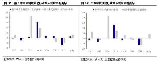 第三勝負手開啟,注意年底風(fēng)格切換,積極布局新的“β”品種,把握跨年行情??缒晷星橛酗L(fēng)格擴散下的補漲特征,建議把握具有估值優(yōu)勢的絕對收益品種。2012年以來,前三季度表現(xiàn)最差的5個行業(yè)第四季度平均上漲6.56%,前三季度表現(xiàn)最好的5個行業(yè)第四季度平均上漲2.93%,7年中有4年前三季度表現(xiàn)后5名的行業(yè)第四季度表現(xiàn)更好。表明跨年行情存在補漲特征。而2012年以來,第三季度末市凈率最低的5個行業(yè)第四季度平均上漲8.58%,市凈率最高的5個行業(yè)第四季度平均上漲0.39%,7年中有5年市凈率最低的5個行業(yè)第四季度表現(xiàn)更好。表明跨年行情應(yīng)把握具有估值優(yōu)勢的絕對收益品種。
