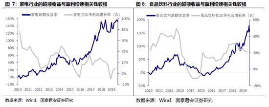 盈利是決定消費股超額收益的主要因素。我們對比了家電行業(yè)、食品飲料行業(yè)相對中證全指的累計超額收益率。家電行業(yè)2014-2016年、食品飲料行業(yè)2012-2015年出現(xiàn)持續(xù)負超額收益的期間,均伴隨盈利增速持續(xù)下滑至負值。在2大行業(yè)盈利增速維持較高水平或增速提升過程中,均有正的超額收益,因此盈利是決定消費行業(yè)股價的主要因素。