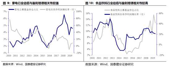 盈利也是決定消費板塊機構(gòu)持倉水平的重要因素。我們對比了公募基金在家電、食品飲料行業(yè)的配置占比與2個行業(yè)扣非凈利潤增速的關(guān)系。2000年以來,公募基金在2大消費行業(yè)的配置與盈利增速有很強的相關(guān)性,因此確定機構(gòu)抱團是否瓦解的關(guān)鍵因素還是盈利。