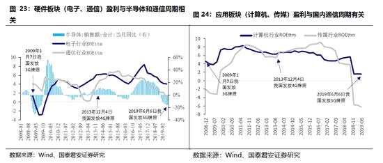科技板塊的盈利當(dāng)前處于低位,且盈利與半導(dǎo)體和通信周期相關(guān),5G周期將拉動科技股盈利回升。硬件為主的電子、通信板塊由于與全球產(chǎn)業(yè)鏈相關(guān)性更緊密,其ROE與全球半導(dǎo)體銷售額增速相關(guān)性較高。我國無線通信網(wǎng)絡(luò)投資約占全球3成,因此全球半導(dǎo)體周期,及A股電子、通信行業(yè)ROE也與國內(nèi)移動通信網(wǎng)絡(luò)牌照發(fā)放相關(guān)性較高。計算機、傳媒等應(yīng)用側(cè)板塊主要面對國內(nèi)市場,國內(nèi)移動通信牌照發(fā)放后計算機和傳媒的ROE進入向上趨勢,可見移動通信對應(yīng)用側(cè)的刺激是計算機和傳媒行業(yè)盈利變化的重要因素。當(dāng)前全球半導(dǎo)體增速在底部出現(xiàn)回升,且半導(dǎo)體行業(yè)下行時間達到2年,此前半導(dǎo)體向下周期也約為2年,因此半導(dǎo)體行業(yè)將復(fù)蘇,疊加國內(nèi)6月發(fā)放5G商用牌照,A股科技股ROE處于近10年來最低水平附近,科技股的盈利有望在低基數(shù)下強勁復(fù)蘇。