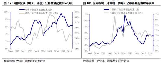 從機構(gòu)持倉上看,科技板塊公募基金配置水平處于2013年以來的低位。電子行業(yè)公募基金配置較2016年高位下降超過1個百分點,通信、計算機和傳媒行業(yè)公募基金配置水平為2013年以來的低位。從交易阻力上講,盡管2019年以來科技板塊表現(xiàn)出色,但機構(gòu)持倉水平仍有較大的提升空間。
