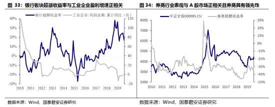 工業(yè)企業(yè)盈利好轉(zhuǎn)預(yù)期利好銀行板塊,A股中長期向好預(yù)期下,券商板塊有望走強。銀行板塊相對中證全指的超額收益與工業(yè)企業(yè)盈利增速變化正相關(guān),且銀行業(yè)的超額收益領(lǐng)先于工業(yè)企業(yè)盈利增速。工業(yè)企業(yè)盈利增速在2019年2月觸底后持續(xù)回升,盈利底的確認有利于銀行板塊實現(xiàn)相對收益。券商板塊的相對收益與A股表現(xiàn)具有較強的正相關(guān),且券商的超額收益率較A股具有領(lǐng)先性。在多重因素共振下A股將中長期向好,券商板塊也有望實現(xiàn)相對收益。