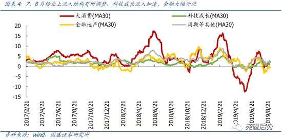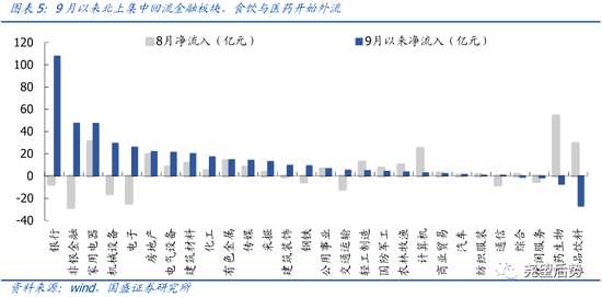 今年下半年以來(lái),北上流入結(jié)構(gòu)相較以往有了一些新變化:首先,北上對(duì)各類風(fēng)格的配置分化度有所收斂;其次,在近期的外資流入過(guò)程中,消費(fèi)和科技成長(zhǎng)呈并駕齊驅(qū)態(tài)勢(shì),以30日流入均值來(lái)看,科技類公司甚至在7-8月的部分階段超過(guò)了消費(fèi)。而9月以來(lái),北上開(kāi)始大幅回流金融,非銀金融和銀行得到大幅增持,9月以來(lái)已分別凈流入107.74億元和47.29億元,金融板塊位居行業(yè)凈流入之首;與此同時(shí),估值水平持續(xù)抬升的食飲和醫(yī)藥行業(yè)遭小幅流出,9月以來(lái)已分別凈流出27.23億元和7.46億元。