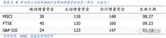 自8月以來(lái),國(guó)際三大指數(shù)明晟、富時(shí)羅素、標(biāo)普道瓊斯相繼宣布A股納入及擴(kuò)容計(jì)劃:8月7日,MSCI 8月季度評(píng)議結(jié)果公布,中國(guó)大盤(pán)A股納入因子將由10%提升至15%,指數(shù)調(diào)整結(jié)果已于8月27日盤(pán)后正式生效;8月24日,富時(shí)羅素季度評(píng)議結(jié)果披露其旗艦指數(shù)全球股票指數(shù)系列第一階段第二批次的A股納入名單,此次調(diào)整后A股納入因子將從5%提升至15%;隨后標(biāo)普道瓊斯指數(shù)也于9月7日公布其評(píng)議結(jié)果并披露首次納入A股的1099只標(biāo)的名單,A股納入因子將一次性達(dá)到25%,富時(shí)羅素和標(biāo)普道瓊斯兩大國(guó)際指數(shù)納入及擴(kuò)容調(diào)整結(jié)果將同時(shí)于9月23日盤(pán)前生效。