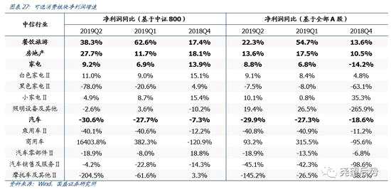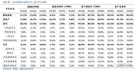 房地產(chǎn)2019Q2的業(yè)績(jī)?cè)鏊贋?7.7%(2019Q1為11.7%),小幅改善。2019年中報(bào)的業(yè)績(jī)主要是對(duì)應(yīng)著2017年上半年的銷售,因此整體凈利潤(rùn)增速有所改善,但隨著后續(xù)地產(chǎn)數(shù)據(jù)的回落,下半年地產(chǎn)業(yè)績(jī)將承壓。