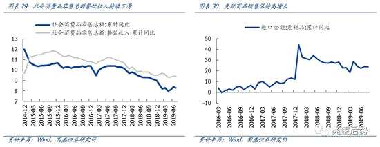 餐飲旅游2019Q2的業(yè)績(jī)?cè)鏊贋?8.3%(2019Q1為62.6%),增速有所放緩。具體來(lái)看社服板塊內(nèi)部存在一定的分化,免稅商品仍維持較高增速;而社消品餐飲的同比較一季度繼續(xù)下滑,餐飲、酒店、旅游受到宏觀經(jīng)濟(jì)影響較大,均有所回落。