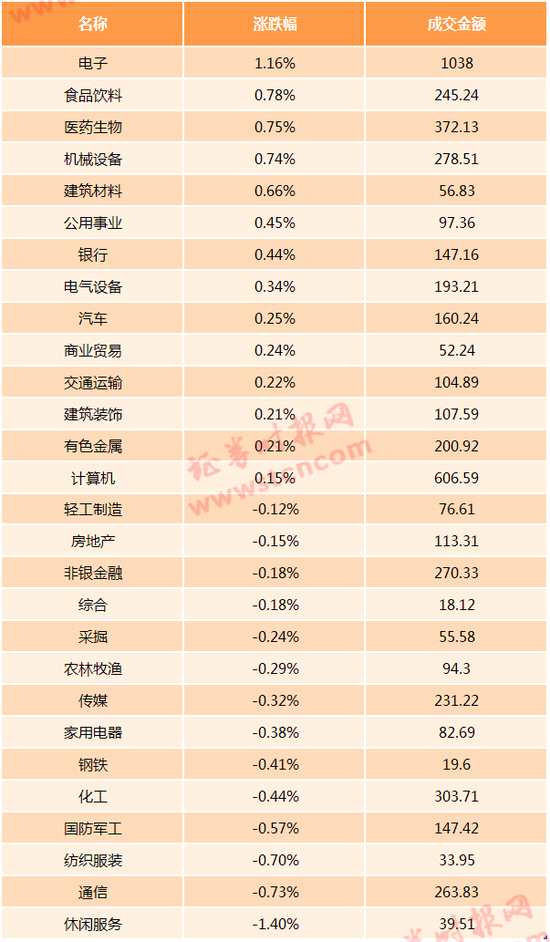 行業(yè)表現(xiàn)方面,近期表現(xiàn)強勢的電子、食品飲料、醫(yī)藥生物今日繼續(xù)領漲,位列行業(yè)漲幅前三。其中電子行業(yè)成交金額破千億元,同樣排名申萬28行業(yè)首位。休閑服務、通信、紡織服裝等行業(yè)跌幅靠前。