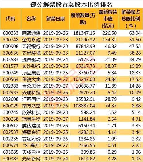 證券時(shí)報(bào)·數(shù)據(jù)寶統(tǒng)計(jì)顯示,44只解禁個(gè)股中,圓通速遞解禁市值最高,其在9月26日有18億股面臨解禁, 以最新收盤計(jì)算,解禁市值為226.5億元;【金力永磁(300748)、股吧】緊隨其后,9月23日有2億股面臨解禁,解禁市值為134.32億元;解禁市值較高的個(gè)股還有南方航空、長(zhǎng)沙銀行,分別為74.37億、58.07億元。