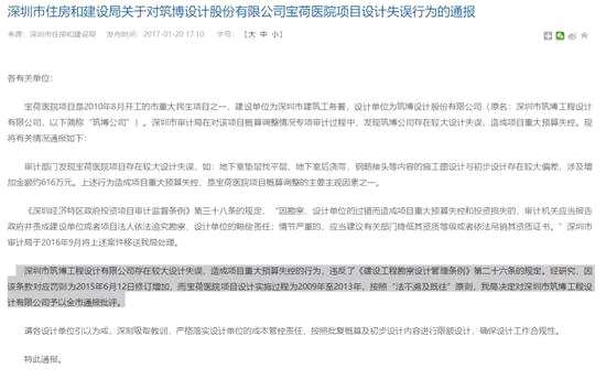 據(jù)《深圳市住房和建設(shè)局關(guān)于對筑博設(shè)計股份有限公司寶荷醫(yī)院項目設(shè)計失誤行為的通報》,寶荷醫(yī)院項目是2010年8月開工的市重大民生項目之一,建設(shè)單位為深圳市建筑工務(wù)署,設(shè)計單位為筑博設(shè)計股份有限公司(原名:深圳市筑博工程設(shè)計有限公司,以下簡稱“筑博公司”)。深圳市審計局在對該項目概算調(diào)整情況專項審計過程中,發(fā)現(xiàn)筑博公司存在較大設(shè)計失誤,造成項目重大預(yù)算失控。