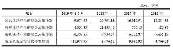 經(jīng)營現(xiàn)金流大降,同時應(yīng)收賬款大幅增長,2017 年12 月31 日、2018 年12 月31 日、2019 年6 月30 日公司合并財務(wù)報表中應(yīng)收賬款的原值分別為22,251.46 萬元、25,618.30 萬元、33,837.93 萬元,壞賬準(zhǔn)備分別為4,846.04 萬元、5,724.45 萬元、6,424.83 萬元。