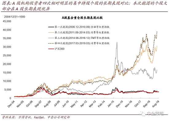 我們分解了外資持有的前100支個股自2016年以來的累計漲幅(約105%),其中約70%收益都來自盈利增長的貢獻(xiàn)。我們在《非典型“抱團(tuán)”》報告中也指出,本次“抱團(tuán)”的股票,以5年周期、10年周期、15年周期來看,也均是A股歷史上表現(xiàn)最優(yōu)異的一批股票。而此前幾次機(jī)構(gòu)抱團(tuán)的股票,抱團(tuán)上漲取得的收益,多數(shù)都來自估值擴(kuò)張;當(dāng)抱團(tuán)解散時,個股往往也會出現(xiàn)較大幅度下跌及估值壓縮,因此長線表現(xiàn)通常并不突出。