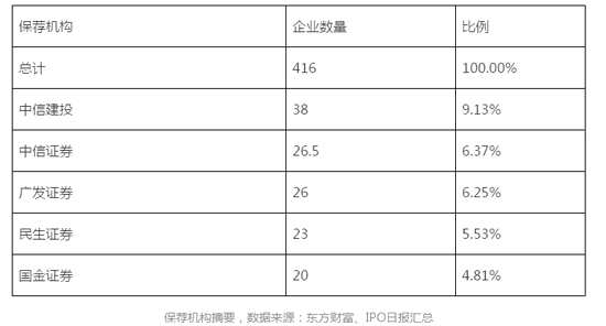 有5家保薦機(jī)構(gòu)的“儲(chǔ)糧”在20家以上,按保薦企業(yè)數(shù)量多少(共同保薦按0.5計(jì)算),排名依次為38家的中信建投、26.5家的中信證券、26家的廣發(fā)證券、23家的民生證券、20家的國(guó)金證券。其中,中信建投保薦的IPO企業(yè)排隊(duì)數(shù)量明顯較高。