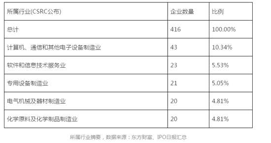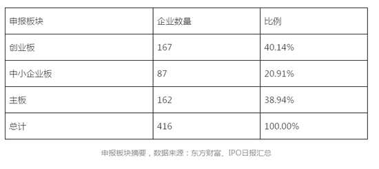 從申報(bào)板塊來(lái)看,416家IPO企業(yè)主要把“目光”放在創(chuàng)業(yè)板和主板,比例分別為40.14%和38.84%,剩余20.91%則是中小板。