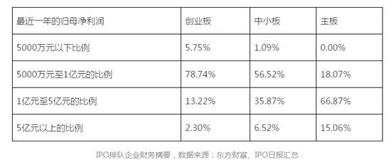 申報(bào)創(chuàng)業(yè)板的,有5.75%的企業(yè)最近一年的歸母凈利潤(rùn)在5000萬(wàn)元以下,屬于值得關(guān)注的區(qū)域;5000萬(wàn)元至1億元的“次級(jí)”關(guān)注區(qū),則分布著創(chuàng)業(yè)板78.74%的IPO企業(yè)。最近一年歸母凈利潤(rùn)多于1億元的創(chuàng)業(yè)板ipo企業(yè),相對(duì)較少,只有15.52%。