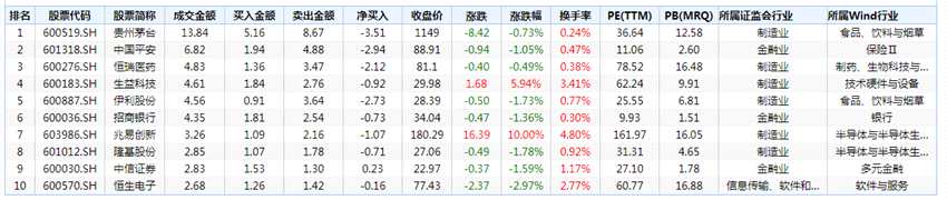 從個股方面來看,滬股通前十大活躍個股榜單中,僅有中信證券(600030)出現(xiàn)凈買入,全天成交2.83億元,凈流入0.23億元。其余9只個股均為凈流出。貴州茅臺(600519)成交額最高,全天成交13.84億元,買入5.16億元,賣出8.67億元,凈流出3.51億元。