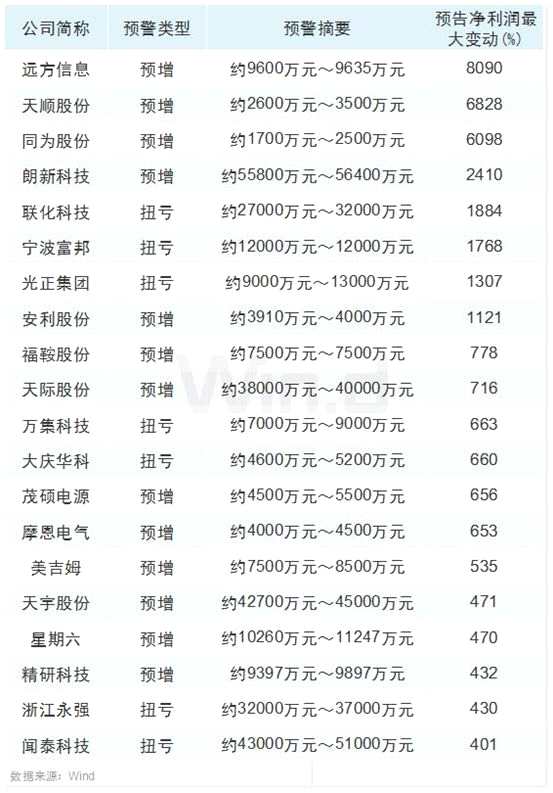 據(jù)wind數(shù)據(jù)顯示,截止目前,在481份三季報業(yè)績預(yù)告中,預(yù)喜(含預(yù)增、續(xù)盈、略增和扭虧)公司有207家,占比47.92%。具體來看,有98家公司三季報凈利預(yù)增上限在100%以上。其中,37家公司凈利預(yù)增上限超過了200%,7家公司凈利預(yù)增上限超過了1000%,遠(yuǎn)方信息以8090%的凈利預(yù)增幅度暫居首位。