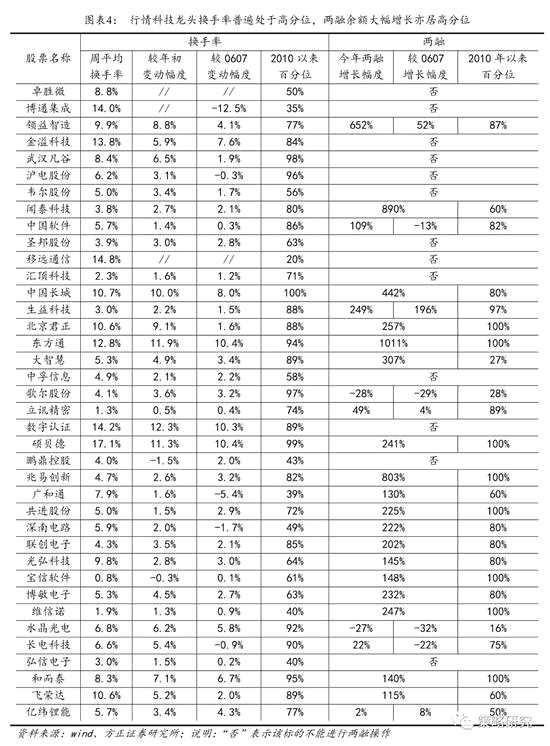 摘要: 【方正策略】熱門科技龍頭身在何處?來源:策略研究核心要點:(1)近期科技龍頭公司交易情緒十分亢奮。表現(xiàn)在換手率、兩融規(guī)模、外資持倉快速提升并升至高分位;(2)中長期角度看,科技龍頭公司仍有很高的性價比