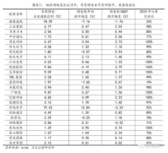 ?。?)外資大幅流入,持倉快速提升,持倉水平普居高位。今年來,剔除非滬深港通標(biāo)的后的47家公司中有41家公司持倉提升了,平均提升了1.93個百分點,自2019.06.06來亦提升了1.18個百分點。47家公司中有38家公司的持倉占比在80%分位水平以上,甚至有11家公司持倉占比創(chuàng)新高。