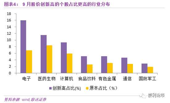 從行業(yè)分布的角度來(lái)看,相比3-4月的高點(diǎn),9月創(chuàng)新高的個(gè)股占比前五的行業(yè)為電子、醫(yī)藥、機(jī)械設(shè)備、計(jì)算機(jī)和化工。若從相對(duì)占比更高的角度出發(fā),即剔除掉原本行業(yè)股票個(gè)數(shù)占比的影響,以芯片、半導(dǎo)體、消費(fèi)電子為代表的科技股,以醫(yī)藥、食品飲料為代表的大消費(fèi)板塊,以及前期受事件催化的有色金屬和國(guó)防軍工概念,其股價(jià)創(chuàng)新高個(gè)數(shù)的占比高于其原本行業(yè)股票個(gè)數(shù)的比例。