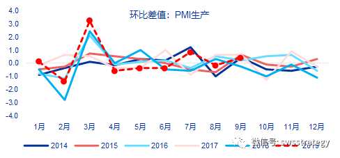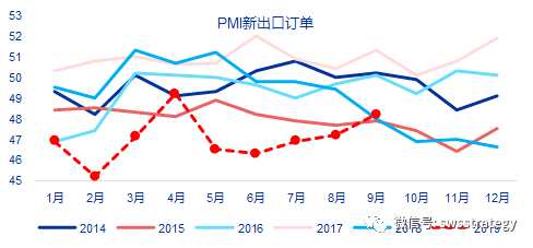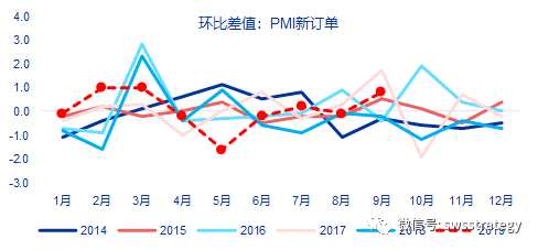 ?。?)9月中國制造業(yè)PMI環(huán)比差值強于季節(jié)性,生產(chǎn)和新訂單均驗證改善。這與中期趨勢和海外數(shù)據(jù)驗證相背離,持續(xù)性有待觀察。另外,9月PMI新出口訂單改善,這可能與海外環(huán)境變化影響基本面的節(jié)奏有關(guān)。