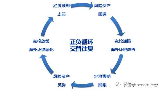 一面是基本面驗證回落,另一面是寬松預期升溫,哪個才是主要矛盾?建立輸入變量和資產(chǎn)價格之間的函數(shù)關(guān)系,才是策略分析師的本職工作。這里分享一些我們近期的思考:經(jīng)濟周期處于衰退期,海外環(huán)境惡化(走出“修昔底德陷阱”不可能一蹴而就),政策空間有限(體現(xiàn)為國內(nèi)的政策主基調(diào)仍是促轉(zhuǎn)型 + 去杠桿,穩(wěn)增長政策難持續(xù);美國有降息動作,卻不愿確認降息周期)是A股市場面臨的長期問題。2018年長期問題集中反映為A股估值中樞下移,而到了2019年A股估值中樞總體已處于底部區(qū)域,對長期問題的反映已開始鈍化,對邊際改善的反映能力恢復,進而演繹出了新的市場特征。我們將這個階段的預期演繹規(guī)律總結(jié)為政策-經(jīng)濟-市場的“交誼舞·短周期版”。具體體現(xiàn)為一種“正負循環(huán),交替往復”的特征:寬松加碼,海外環(huán)境改善à經(jīng)濟預期回暖 à風險資產(chǎn)反彈 à寬松放緩,海外環(huán)境惡化 à經(jīng)濟預期走弱 à風險資產(chǎn)回調(diào) à寬松加碼,海外環(huán)境改善 à……曾經(jīng)的“交誼舞”是中長周期的,一個循環(huán)可能要3年走完,而現(xiàn)在的“交誼舞”是十足的短周期,三個月就可以循環(huán)往復。