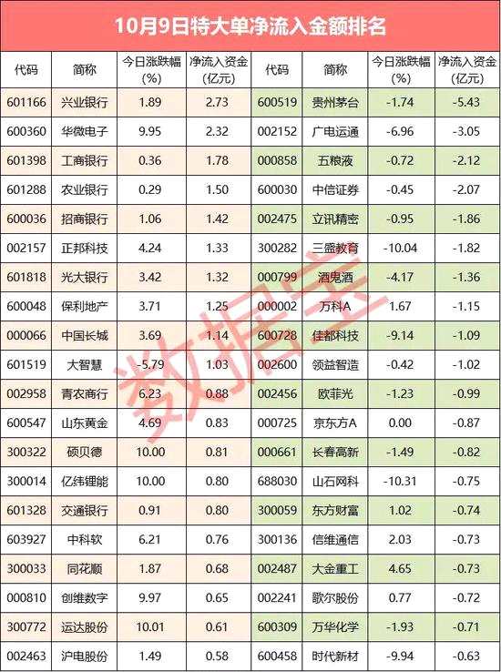個(gè)股來(lái)看,今日有10只股票特大單凈流入超億元,半數(shù)為銀行股。興業(yè)銀行凈流入資金規(guī)模居首,全天特大單凈流入2.73億元;華微電子緊隨其后,特大單凈流入資金2.32億元;凈流入資金居前的還有工商銀行、農(nóng)業(yè)銀行、招商銀行等。