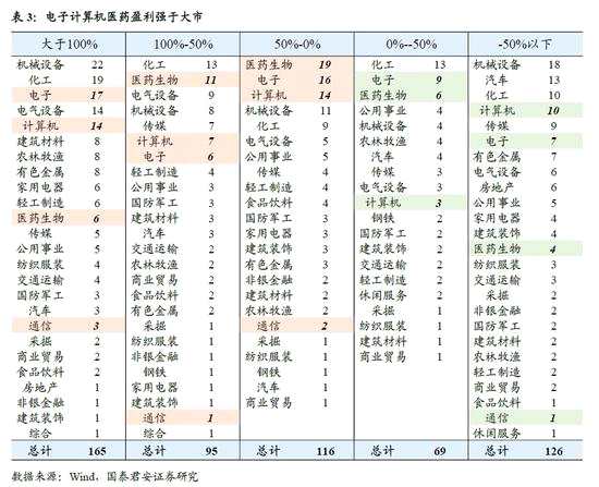 結(jié)構(gòu)上,哪些行業(yè)的盈利整體出現(xiàn)顯著回升?哪些又不是預(yù)期之內(nèi)的?拆分571家預(yù)計預(yù)告到行業(yè)維度,我們發(fā)現(xiàn)整體盈利出現(xiàn)顯著的分化。在分析前,我們需要注意披露存在樣本偏差——行業(yè)成份股數(shù)量較大的行業(yè)存在偏差,如機械設(shè)備、化工等行業(yè)分析意義不大。核心三大結(jié)論:1)TMT盈利的確顯著在回升,電子、計算機盈利明顯強于通信。以電子為例,從披露的利潤增速數(shù)據(jù)來看(我們參考業(yè)績預(yù)告上限),電子行業(yè)披露的盈利增速大于100%的個股有17家,100%-50%有6家,50%-0的有16家,負增長共16家,盈利景氣明顯強于大市。2)醫(yī)藥生物盈利景氣高,類似電子等行業(yè),但是這實屬預(yù)期之內(nèi)。3)整體來看,周期行業(yè)的盈利景氣度仍較低,業(yè)績不確定性仍大。
