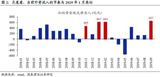 貿(mào)易緩和的市場預(yù)期體現(xiàn)之二:外資流入的蛛絲馬跡。我們認為,外資的行為趨勢可以反映的緩和預(yù)期。從周度的外資凈流入數(shù)據(jù)上看,9月的流入趨勢堪比2019年1月,重回快節(jié)奏流入時間段。從月度數(shù)據(jù)上看,9月外資凈流入規(guī)模為647億元,而2019年1月為607億元,2月為604億元。從這個維度上看,當(dāng)前的外資正在形成類似2019年1月的市場預(yù)期,而這比之前市場環(huán)境相比的關(guān)鍵邊際變化在于貿(mào)易關(guān)系的變化。按此邏輯分析,疊加盈利的趨勢性修復(fù),我們認為10月乃至11月的外資流入趨勢將仍保持較大規(guī)模。
