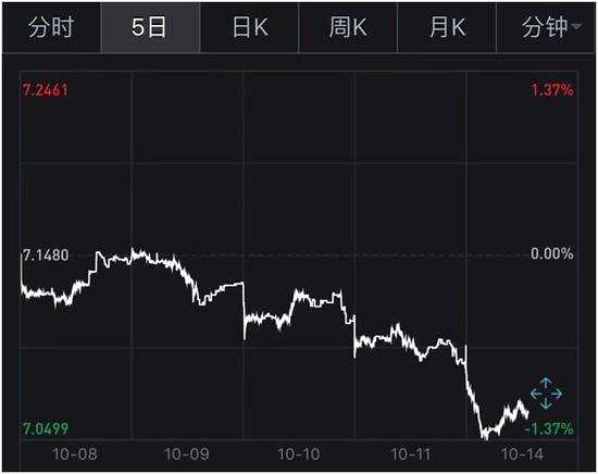 最近五個(gè)交易日,人民幣匯率已從7.14附近回調(diào)近1%,10月10日當(dāng)天離岸人民幣盤(pán)中甚至一度罕有地大幅反彈超600點(diǎn)。