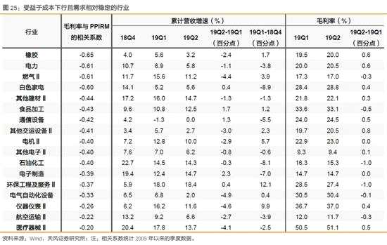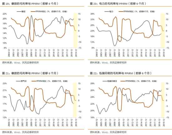 2、各行業(yè)對原材料價格的敏感性、傳導(dǎo)時滯及后市判斷原材料價格下降,能否帶來毛利率和凈利潤增速的提升,關(guān)鍵在于成本下降幅度是否大于收入下降幅度,因為毛利率本質(zhì)上取決于產(chǎn)成品和原材料的價差。當(dāng)前,原材料價格持續(xù)回落了較長時間,價格中樞相對18年已明顯下降,這可能使得利潤在產(chǎn)業(yè)鏈間重新分配,中游制造業(yè)的利潤空間有可能得到釋放。從宏觀環(huán)境看,19年與14年許多相似之處(經(jīng)濟下行周期、地產(chǎn)下行周期),但當(dāng)前貨幣寬松節(jié)奏控制,謹(jǐn)慎前行,還是以托底經(jīng)濟為主。在這種情況下,總需求和商品價格上行空間有限,在未來較長時間內(nèi),上游商品價格大概率整體水平維持相對低位。因此,對于需求下滑空間不大或景氣相對較高的行業(yè),原材料成本的下降有望帶來盈利的持續(xù)改善,這個思路將成為未來一段時間重要的行業(yè)選擇思路。那么,有哪些細分行業(yè)對原材料價格敏感?具體來說,可通過毛利率與原材料價格的關(guān)系來分析。以產(chǎn)業(yè)鏈上下游視角來看,毛利率取決于:下游出廠價格(PPI)-下游購進價格(PPIRM)或上游出廠價格(PPI)。進一步,我們通過計算申萬各行業(yè)的毛利率水平與PPI、PPIRM、(PPI-PPIRM)、CPI等的相關(guān)系數(shù),可以大體上判斷各行業(yè)對原材料價格的敏感性。由于宏觀指標(biāo)的行業(yè)分類并不一致,且與申萬行業(yè)分類也并非一一對應(yīng)關(guān)系,考慮到本文研究目的是原材料價格的影響,因此我們主要考查行業(yè)毛利率與PPIRM(共九個大類)的相關(guān)系數(shù)。