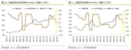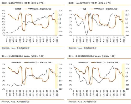 第一,與工業(yè)生產(chǎn)者購進價格(PPIRM,前移6個月)負(fù)相關(guān)較明顯的一級行業(yè)有:公用事業(yè)、家電電器、紡織服裝、食品飲料、建筑裝飾、商業(yè)貿(mào)易、化工、機械設(shè)備、電氣設(shè)備、醫(yī)藥生物等。其中,公用事業(yè)、家電、紡服、建筑、化工、機械、電氣設(shè)備等行業(yè)直接受益于原材料成本的下降,進而毛利率提升;而食品飲料、商貿(mào)、醫(yī)藥等行業(yè)的毛利率與PPIRM也顯示出負(fù)相關(guān)性,可能也與這些行業(yè)的毛利率長期趨勢向上有關(guān)。