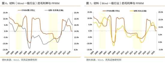 可見,原材料價格下降,在周期底部帶來中游材料或制造業(yè)盈利改善的可能性較大。這一點,從工業(yè)行業(yè)的盈利趨勢與原材料價格的關(guān)系也可得到驗證。從工業(yè)(Wind一級行業(yè))的盈利能力(毛利率、ROE)與原材料價格(PPIRM)的關(guān)系可看出,在大部分年份,盈利與價格趨勢是同向變動,但在06年、14年、17年均出現(xiàn)了原材料價格下行且盈利能力反而得到改善的情況。這三個階段分別對應(yīng)著宏觀經(jīng)濟的復(fù)蘇階段、衰退階段、衰退階段。另外,材料(Wind一級行業(yè))的盈利能力與原材料價格大部分時候表現(xiàn)出同向變動關(guān)系,因為對于材料行業(yè)來說,PPIRM更多體現(xiàn)的是收入端變化。