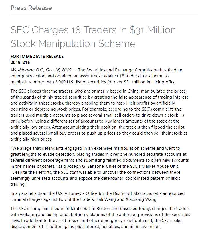 美國時間10月16日,美國證監(jiān)會網站發(fā)布消息稱,已凍結了18名以中國作為基地的交易員資產,他們涉嫌操縱市場,非法獲利超過3100萬美元。