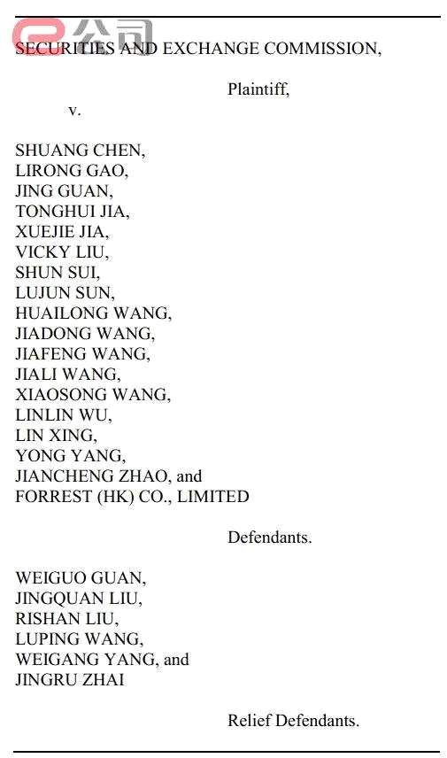 美國(guó)證券交易委員會(huì)提供的資料顯示,18個(gè)交易商中,17名為自然人,剩余1家為注冊(cè)在香港的企業(yè)。此外,還包括救濟(jì)被告(Relief Defendants)6人。其中,美國(guó)馬薩諸塞州地區(qū)檢察官辦公室宣布,對(duì)其中兩名交易者——王佳立(Jiali Wang,音譯)和王曉松(Xiaosong Wang,音譯)提起公訴。