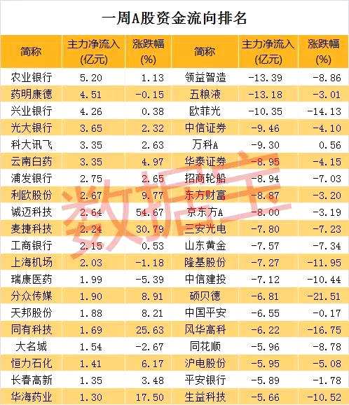 個股方面,剔除近一個月上市的次新股,本周共27股主力資金凈流入超億元,較上周大幅減少。農(nóng)業(yè)銀行主力資金凈流入5.2億元居首,該股本周上漲1.13%。藥明康德、興業(yè)銀行主力資金凈流入分別為4.51億元、4.26億元,其中藥明康德小幅下跌0.15%,興業(yè)銀行小幅上漲0.38%。本周凈流入規(guī)模較大還有的光大銀行、科大訊飛、云南白藥、浦發(fā)銀行、利歐股份等。