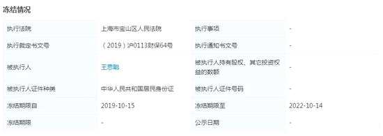 天眼查數(shù)據(jù)顯示,由王思聰擔(dān)任董事長(zhǎng)并持股100%的北京普思投資有限公司(簡(jiǎn)稱“普思資本”)股權(quán)遭到上海市寶山區(qū)人民法院凍結(jié),具體凍結(jié)數(shù)額不祥,凍結(jié)日期自2019年10月15日起至2022年10月14日。