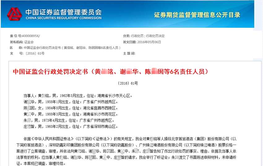 而在2016年5月,歷經(jīng)長(zhǎng)期調(diào)查,關(guān)于黃某銘團(tuán)隊(duì)操縱市場(chǎng)的罰單終于落地,證監(jiān)會(huì)最終認(rèn)定,黃某銘等人操縱首旅酒店、【勁嘉股份(002191)、股吧】、珠江啤酒3只個(gè)股,合計(jì)違法所得達(dá)到3.25億元。其中,黃某銘被責(zé)令依法處理非法持有的證券,并罰沒(méi)6.49億元;對(duì)團(tuán)隊(duì)成員謝某華、陳某囡、黃某中、朱某給予警告并分別處以90萬(wàn)元罰款。
